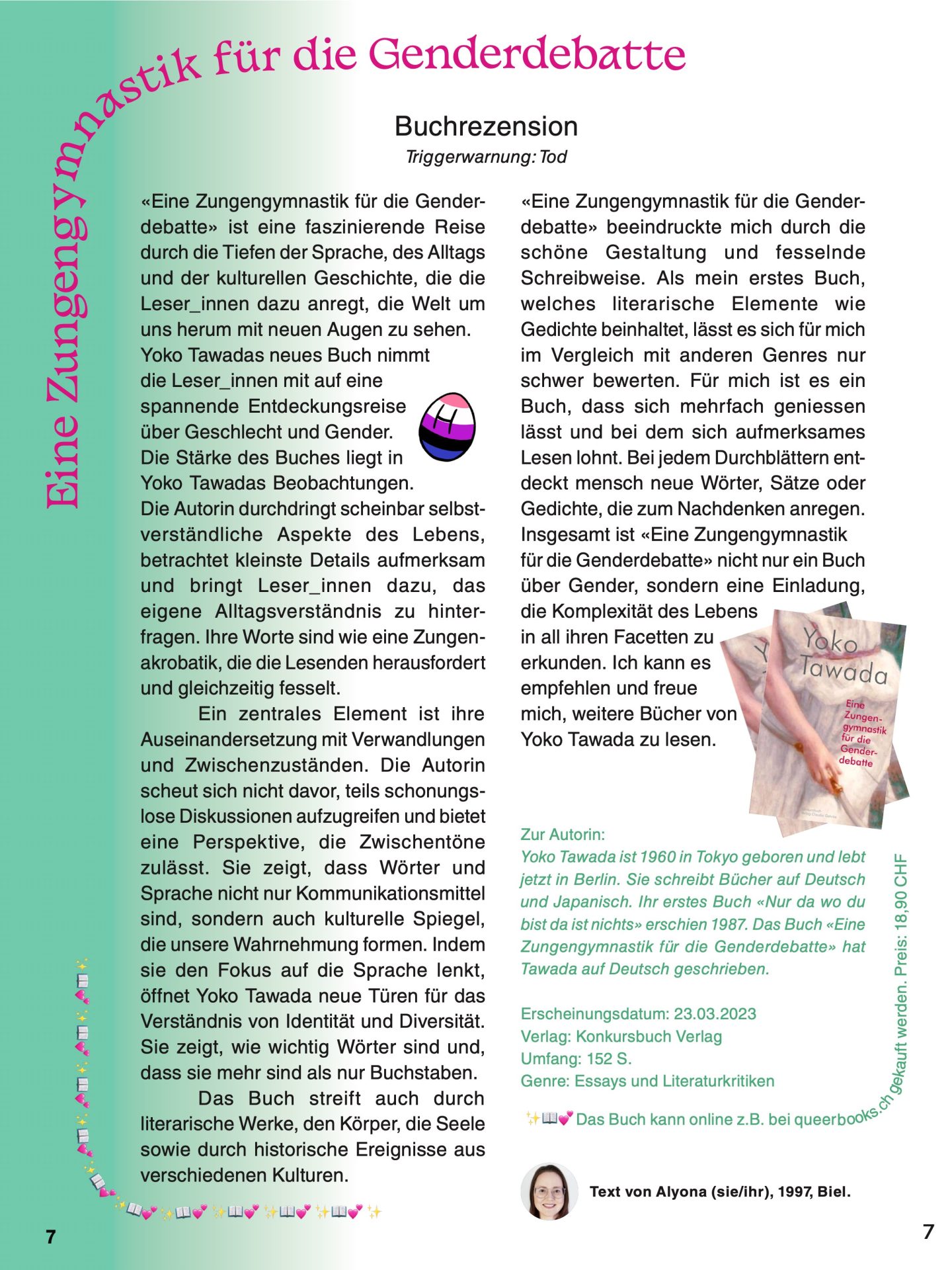 «Eine Zungengymnastik für die Genderdebatte» beeindruckte mich durch die schöne Gestaltung und fesselnde Schreibweise. Als mein erstes Buch, welches literarische Elemente wie Gedichte beinhaltet, lässt es sich für mich im Vergleich mit anderen Genres nur schwer bewerten. Für mich ist es ein Buch, dass sich mehrfach geniessen lässt und bei dem sich aufmerksames Lesen lohnt. Bei jedem Durchblättern entdeckt mensch neue Wörter, Sätze oder Gedichte, die zum Nachdenken anregen. Insgesamt ist «Eine Zungengymnastik für die Genderdebatte» nicht nur ein Buch über Gender, sondern eine Einladung, die Komplexität des Lebens in all ihren Facetten zu erkunden. Ich kann es empfehlen und freue mich, weitere Bücher von Yoko Tawada zu lesen.