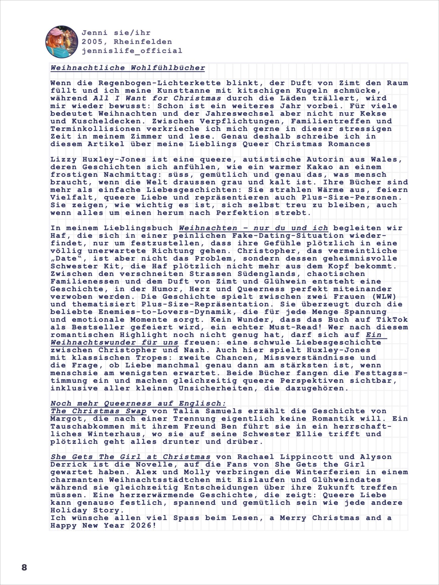 Lizzy Huxley-Jones ist eine queere, autistische Autorin aus Wales, deren Geschichten sich anfühlen, wie ein warmer Kakao an einem frostigen Nachmittag: süss, gemütlich und genau das, was mensch braucht, wenn die Welt draussen grau und kalt ist. Ihre Bücher sind mehr als einfache Liebesgeschichten: Sie strahlen Wärme aus, feiern Vielfalt, queere Liebe und repräsentieren auch Plus-Size-Personen. Sie zeigen, wie wichtig es ist, sich selbst treu zu bleiben, auch wenn alles um einen herum nach Perfektion strebt.