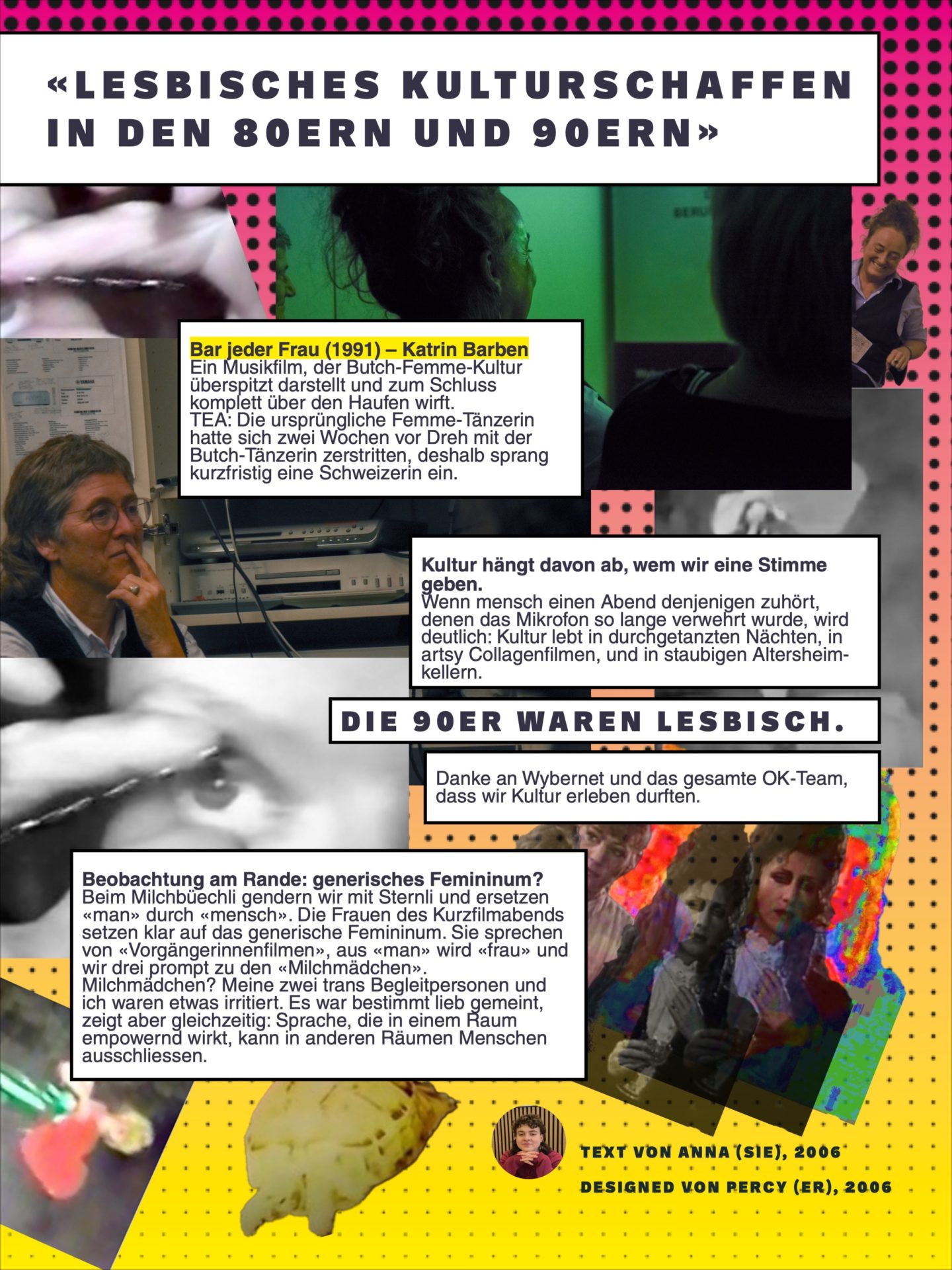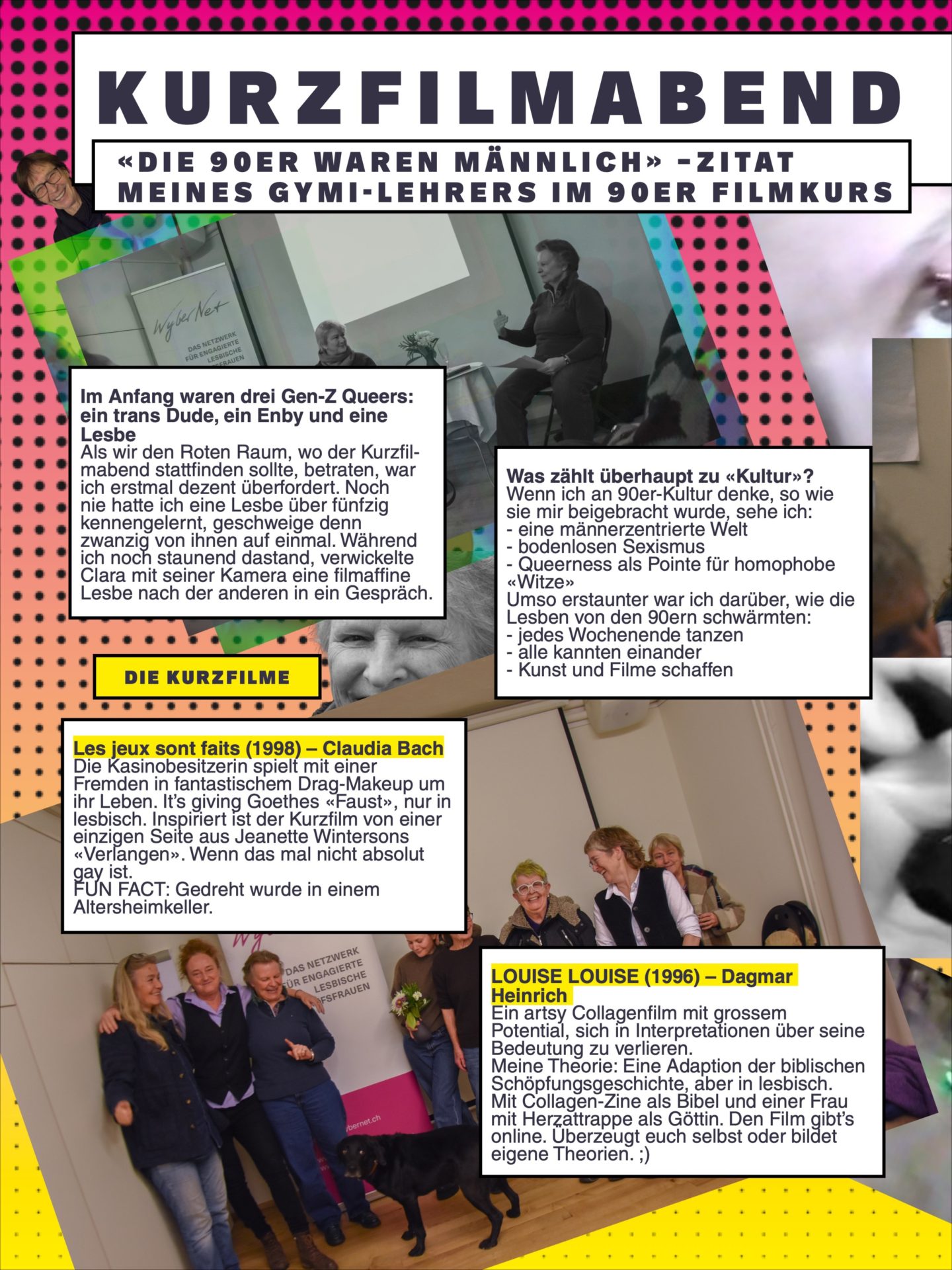 Wenn ich an 90er-Kultur denke, so wie sie mir beigebracht wurde, sehe ich: eine männerzentrierte Welt, bodenlosen Sexismus, Queerness als Pointe für homophobe «Witze». Umso erstaunter war ich darüber, wie die Lesben von den 90ern schwärmten: jedes Wochenende tanzen, alle kannten einander, Kunst und Filme schaffen.