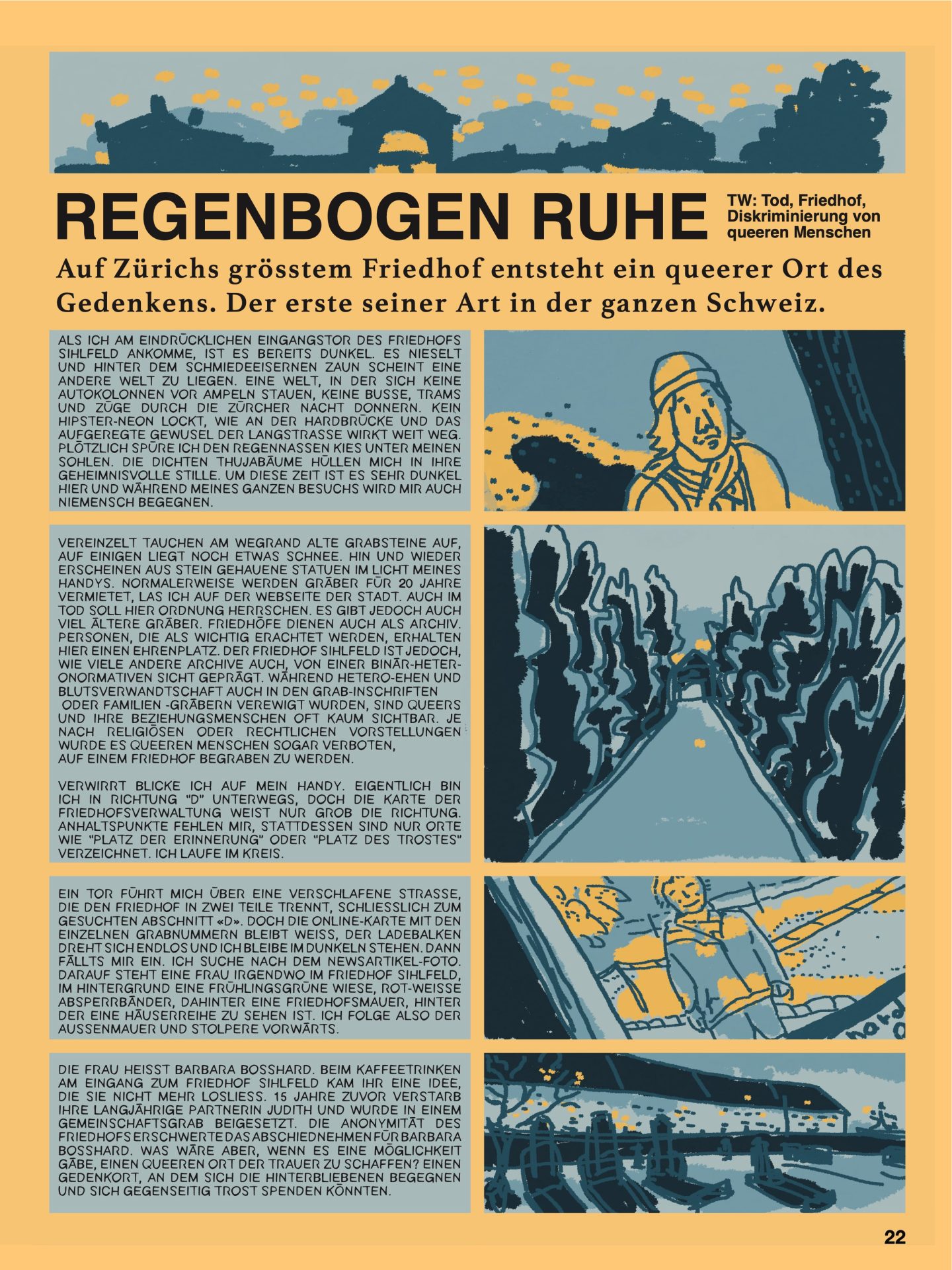 DIE FRAU HEISST BARBARA BOSSHARD. BEIM KAFFEETRINKEN AM EINGANG ZUM FRIEDHOF SIHLFELD KAM IHR EINE IDEE, DIE SIE NICHT MEHR LOSLIESS. 15 JAHRE ZUVOR VERSTARB IHRE LANGJÄHRIGE PARTNERIN JUDITH UND WURDE IN EINEM GEMEINSCHAFTSGRAB BEIGESETZT. DIE ANONYMITÄT DES FRIEDHOFS ERSCHWERTE DAS ABSCHIEDNEHMEN FÜR BARBARA BOSSHARD. WAS WÄRE ABER, WENN ES EINE MÖGLICHKEIT GÄBE, EINEN QUEEREN ORT DER TRAUER ZU SCHAFFEN? EINEN GEDENKORT, AN DEM SICH DIE HINTERBLIEBENEN BEGEGNEN UND SICH GEGENSEITIG TROST SPENDEN KÖNNTEN.