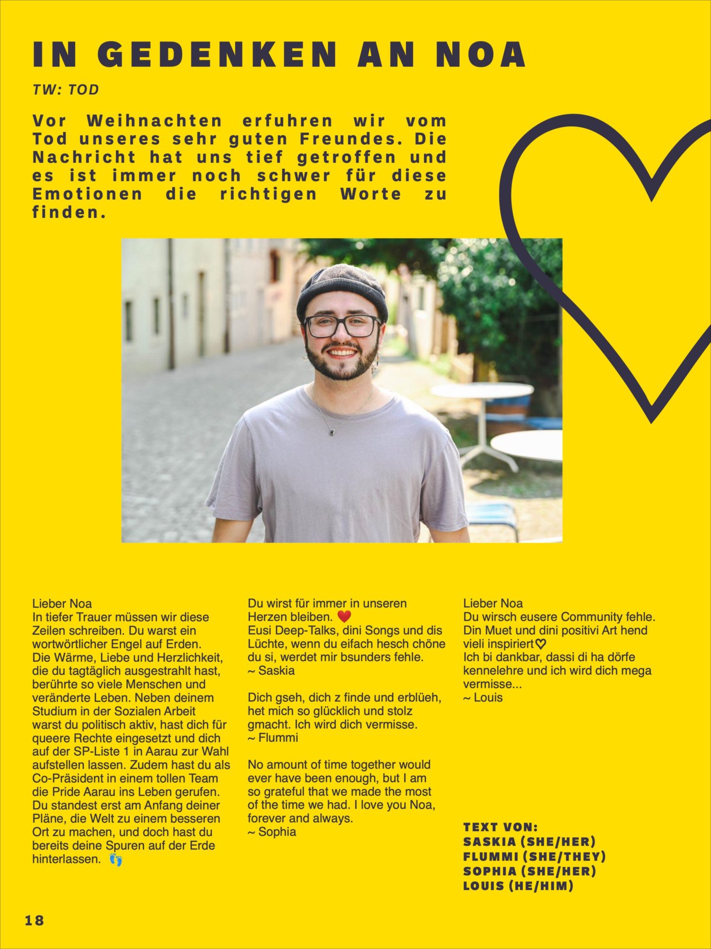Die Wärme, Liebe und Herzlichkeit, die du tagtäglich ausgestrahlt hast, berührte so viele Menschen und veränderte Leben. Neben deinem Studium in der Sozialen Arbeit warst du politisch aktiv, hast dich für queere Rechte eingesetzt und dich auf der SP-Liste 1 in Aarau zur Wahl aufstellen lassen. Zudem hast du als Co-Präsident in einem tollen Team die Pride Aarau ins Leben gerufen.