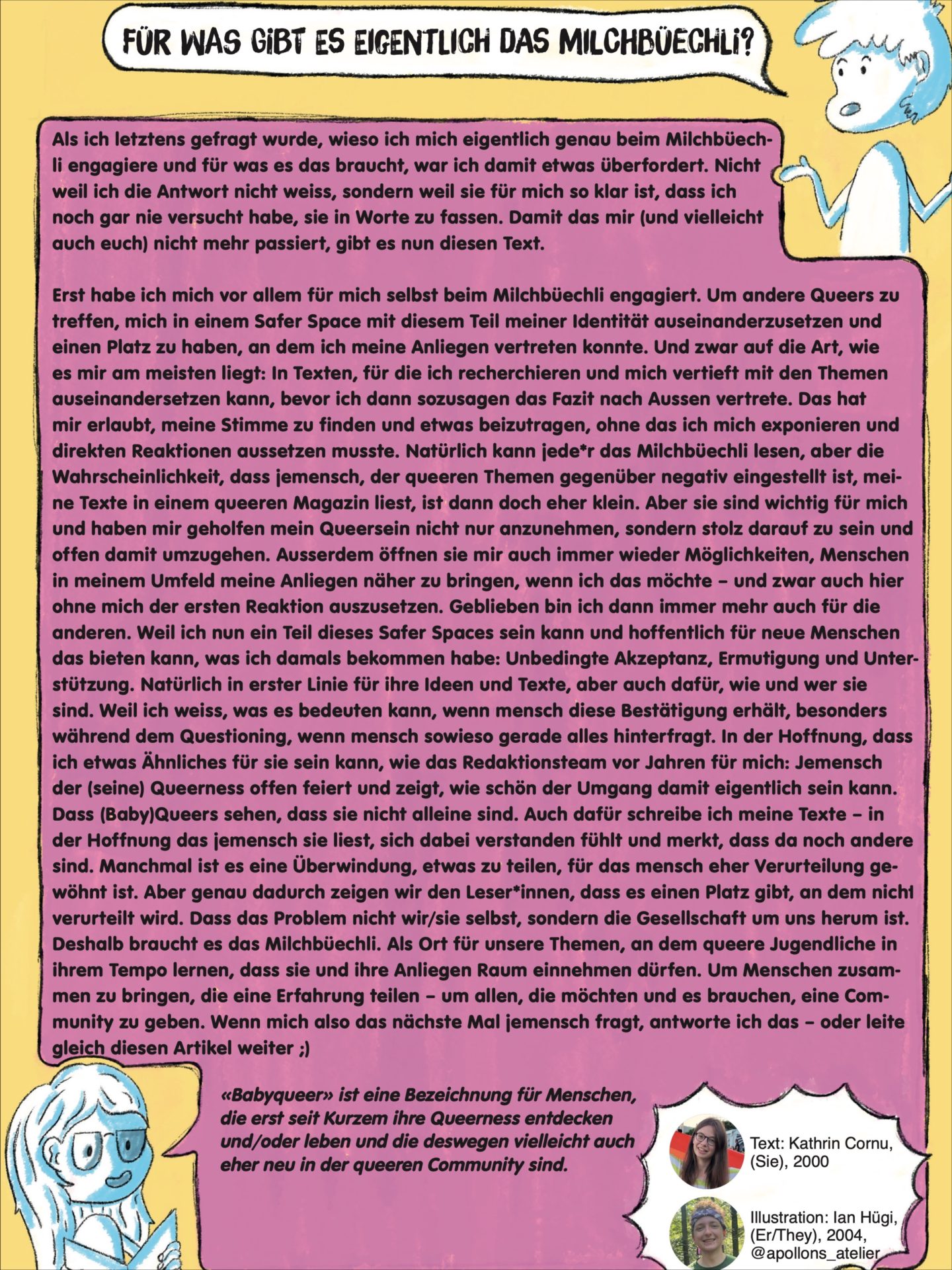 Erst habe ich mich vor allem für mich selbst beim Milchbüechli engagiert. Um andere Queers zu treffen, mich in einem Safer Space mit diesem Teil meiner Identität auseinanderzusetzen und einen Platz zu haben, an dem ich meine Anliegen vertreten konnte. Und zwar auf die Art, wie es mir am meisten liegt: In Texten, für die ich recherchieren und mich vertieft mit den Themen auseinandersetzen kann, bevor ich dann sozusagen das Fazit nach Aussen vertrete. Das hat mir erlaubt, meine Stimme zu finden und etwas beizutragen, ohne das ich mich exponieren und direkten Reaktionen aussetzen musste. Natürlich kann jede*r das Milchbüechli lesen, aber die Wahrscheinlichkeit, dass jemensch, der queeren Themen gegenüber negativ eingestellt ist, meine Texte in einem queeren Magazin liest, ist dann doch eher klein. Aber sie sind wichtig für mich und haben mir geholfen mein Queersein nicht nur anzunehmen, sondern stolz darauf zu sein und offen damit umzugehen. Ausserdem öffnen sie mir auch immer wieder Möglichkeiten, Menschen in meinem Umfeld meine Anliegen näher zu bringen, wenn ich das möchte – und zwar auch hier ohne mich der ersten Reaktion auszusetzen. Geblieben bin ich dann immer mehr auch für die anderen. Weil ich nun ein Teil dieses Safer Spaces sein kann und hoffentlich für neue Menschen das bieten kann, was ich damals bekommen habe: Unbedingte Akzeptanz, Ermutigung und Unterstützung. Natürlich in erster Linie für ihre Ideen und Texte, aber auch dafür, wie und wer sie sind. Weil ich weiss, was es bedeuten kann, wenn mensch diese Bestätigung erhält, besonders während dem Questioning, wenn mensch sowieso gerade alles hinterfragt. In der Hoffnung, dass ich etwas Ähnliches für sie sein kann, wie das Redaktionsteam vor Jahren für mich: Jemensch der (seine) Queerness offen feiert und zeigt, wie schön der Umgang damit eigentlich sein kann. Dass (Baby)Queers sehen, dass sie nicht alleine sind. Auch dafür schreibe ich meine Texte – in der Hoffnung das jemensch sie liest, sich dabei verstanden fühlt und merkt, dass da noch andere sind. Manchmal ist es eine Überwindung, etwas zu teilen, für das mensch eher Verurteilung gewöhnt ist. Aber genau dadurch zeigen wir den Leser*innen, dass es einen Platz gibt, an dem nicht verurteilt wird. Dass das Problem nicht wir/sie selbst, sondern die Gesellschaft um uns herum ist. Deshalb braucht es das Milchbüechli. Als Ort für unsere Themen, an dem queere Jugendliche in ihrem Tempo lernen, dass sie und ihre Anliegen Raum einnehmen dürfen. Um Menschen zusammen zu bringen, die eine Erfahrung teilen – um allen, die möchten und es brauchen, eine Community zu geben. Wenn mich also das nächste Mal jemensch fragt, antworte ich das – oder leite gleich diesen Artikel weiter 😉
