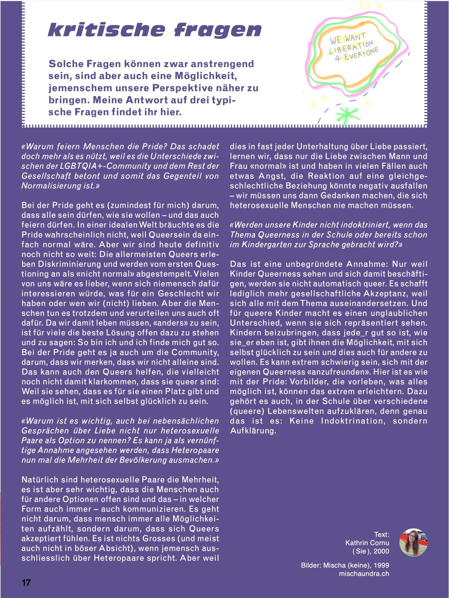 Das ist eine unbegründete Annahme: Nur weil Kinder Queerness sehen und sich damit beschäfti-gen, werden sie nicht automatisch queer. Es schafft lediglich mehr gesellschaftliche Akzeptanz, weil sich alle mit dem Thema auseinandersetzen. Und für queere Kinder macht es einen unglaublichen Unterschied, wenn sie sich repräsentiert sehen. Kindern beizubringen, dass jede_r gut so ist, wie sie_er eben ist, gibt ihnen die Möglichkeit, mit sich selbst glücklich zu sein und dies auch für andere zu wollen. Es kann extrem schwierig sein, sich mit der eigenen Queerness «anzufreunden». Hier ist es wie mit der Pride: Vorbilder, die vorleben, was alles möglich ist, können das extrem erleichtern. Dazu gehört es auch, in der Schule über verschiedene (queere) Lebenswelten aufzuklären, denn genau das ist es: Keine Indoktrination, sondern Aufklärung.