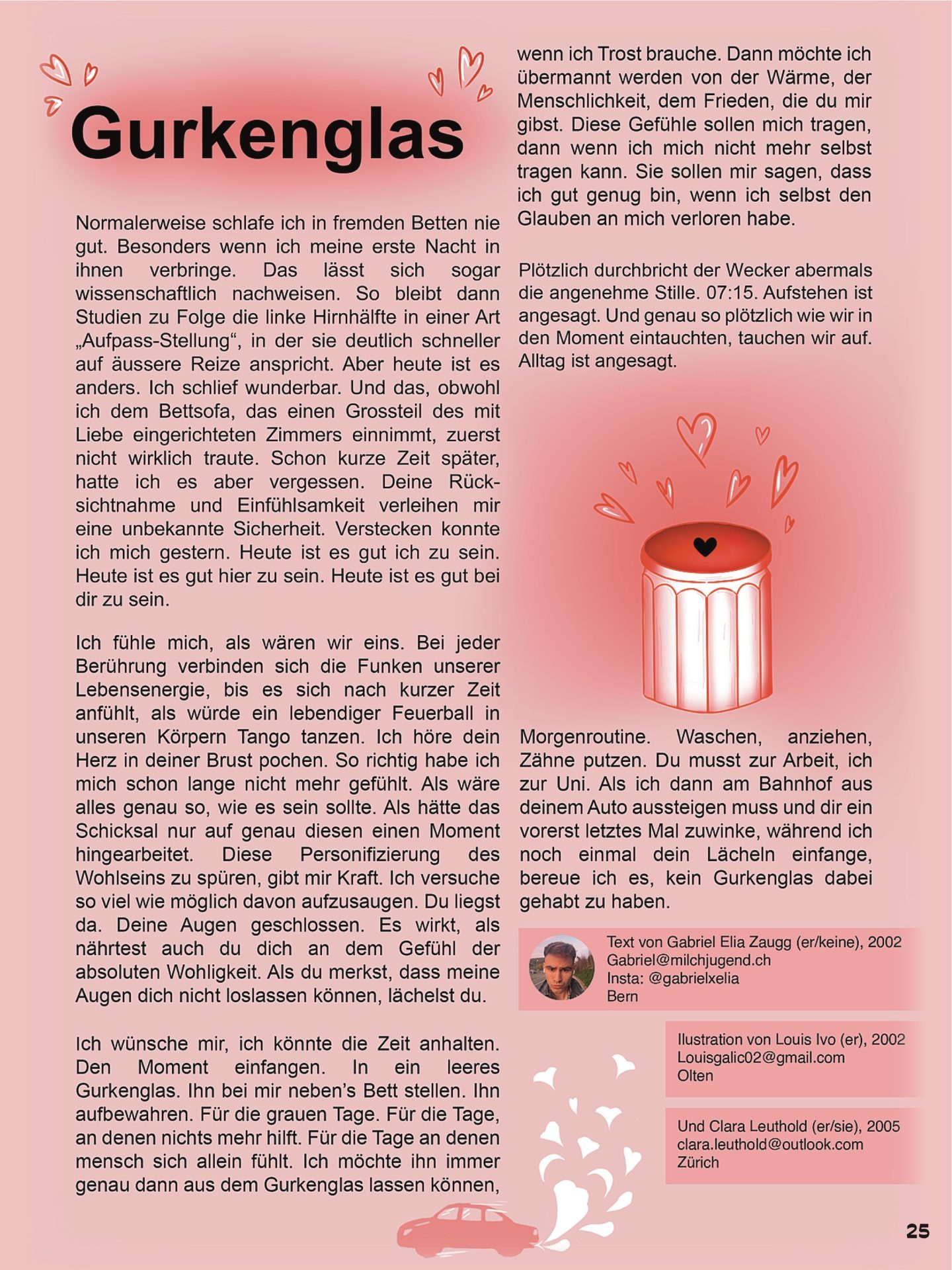 Alltag ist angesagt. Morgenroutine. Waschen, anziehen, Zähne putzen. Du musst zur Arbeit, ich zur Uni. Als ich dann am Bahnhof aus deinem Auto aussteigen muss und dir ein vorerst letztes Mal zuwinke, während ich noch einmal dein Lächeln einfange, bereue ich es, kein Gurkenglas dabei gehabt zu haben.