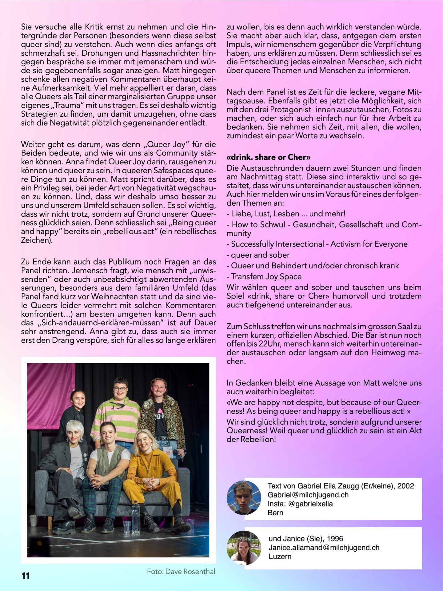 Weiter geht es darum, was denn „Queer Joy“ für die Beiden bedeute, und wie wir uns als Community stärken können. Anna findet Queer Joy darin, rausgehen zu können und queer zu sein. In queeren Safespaces queere Dinge tun zu können. Matt spricht darüber, dass es ein Privileg sei, bei jeder Art von Negativität wegschauen zu können. Und, dass wir deshalb umso besser zu uns und unserem Umfeld schauen sollen. Es sei wichtig, dass wir nicht trotz, sondern auf Grund unserer Queerness glücklich seien. Denn schliesslich sei „Being queer and happy“ bereits ein „rebellious act“ (ein rebellisches Zeichen).