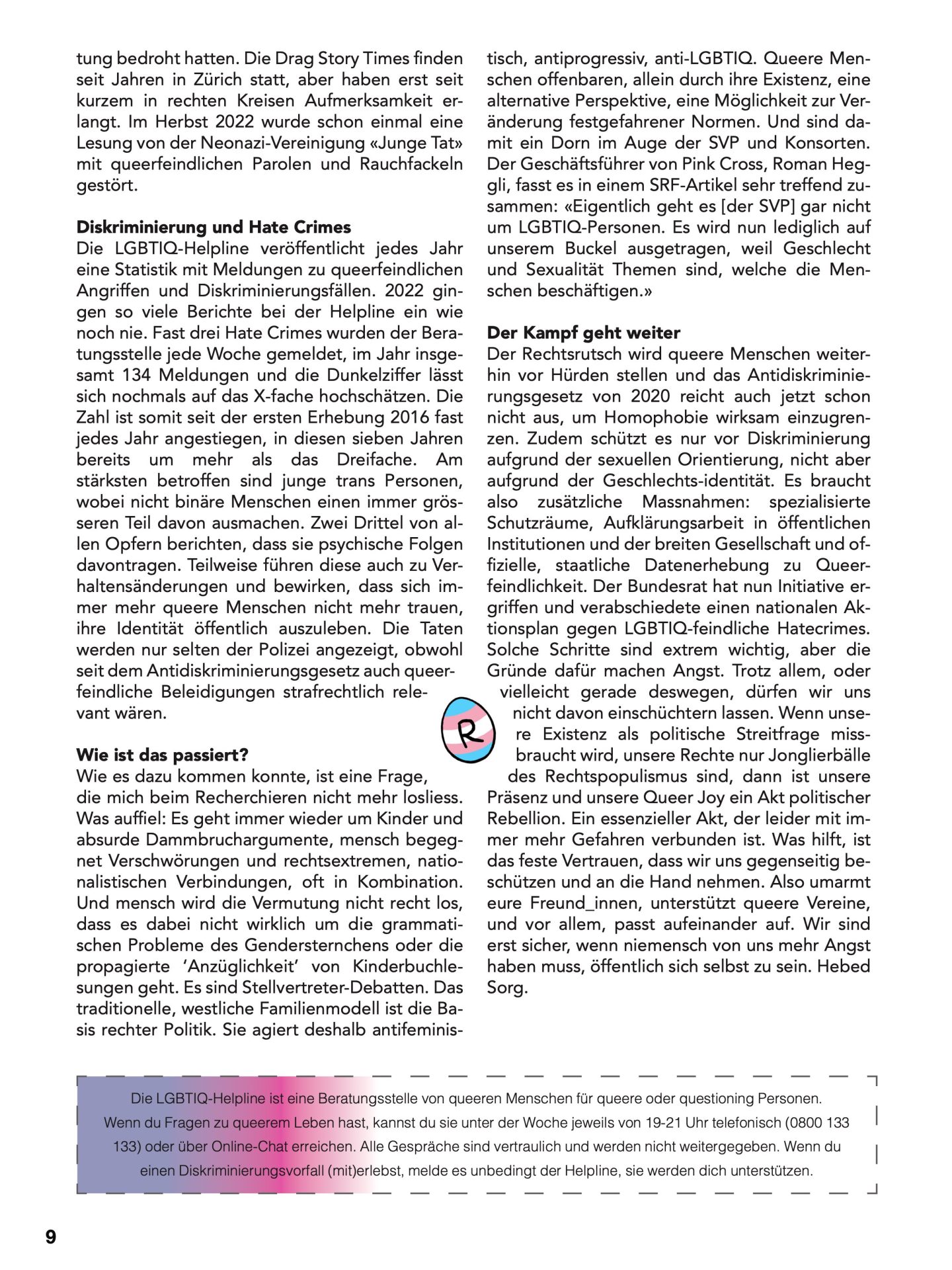 Der Rechtsrutsch wird queere Menschen weiterhin vor Hürden stellen und das Antidiskriminierungsgesetz von 2020 reicht auch jetzt schon nicht aus, um Homophobie wirksam einzugrenzen. Zudem schützt es nur vor Diskriminierung aufgrund der sexuellen Orientierung, nicht aber aufgrund der Geschlechtsidentität. Es braucht also zusätzliche Massnahmen: spezialisierte Schutzräume, Aufklärungsarbeit in öffentlichen Institutionen und der breiten Gesellschaft und offizielle, staatliche Datenerhebung zu Queerfeindlichkeit. Der Bundesrat hat nun Initiative ergriffen und verabschiedete einen nationalen Aktionsplan gegen LGBTIQ-feindliche Hatecrimes. Solche Schritte sind extrem wichtig, aber die Gründe dafür machen Angst. Trotz allem, oder vielleicht gerade deswegen, dürfen wir uns nicht davon einschüchtern lassen. Wenn unsere Existenz als politische Streitfrage missbraucht wird, unsere Rechte nur Jonglierbälle des Rechtspopulismus sind, dann ist unsere Präsenz und unsere Queer Joy ein Akt politischer Rebellion. Ein essenzieller Akt, der leider mit immer mehr Gefahren verbunden ist. Was hilft, ist das feste Vertrauen, dass wir uns gegenseitig beschützen und an die Hand nehmen. Also umarmt eure Freund_innen, unterstützt queere Vereine, und vor allem, passt aufeinander auf. Wir sind erst sicher, wenn niemensch von uns mehr Angst haben muss, öffentlich sich selbst zu sein. Hebed Sorg.