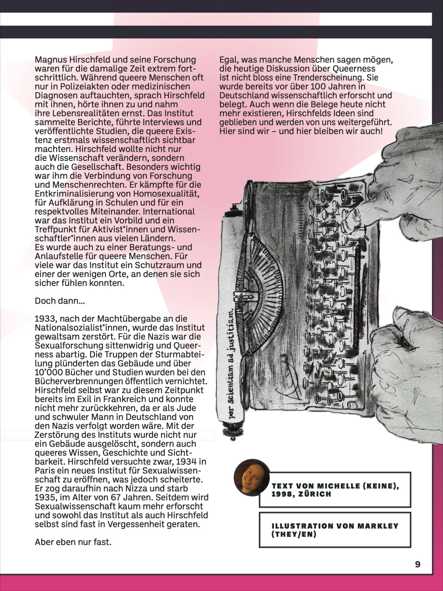 Egal, was manche Menschen sagen mögen, die heutige Diskussion über Queerness ist nicht bloss eine Trenderscheinung. Sie wurde bereits vor über 100 Jahren in Deutschland wissenschaftlich erforscht und belegt. Auch wenn die Belege heute nicht mehr existieren, Hirschfelds Ideen sind geblieben und werden von uns weitergeführt. Hier sind wir – und hier bleiben wir auch!