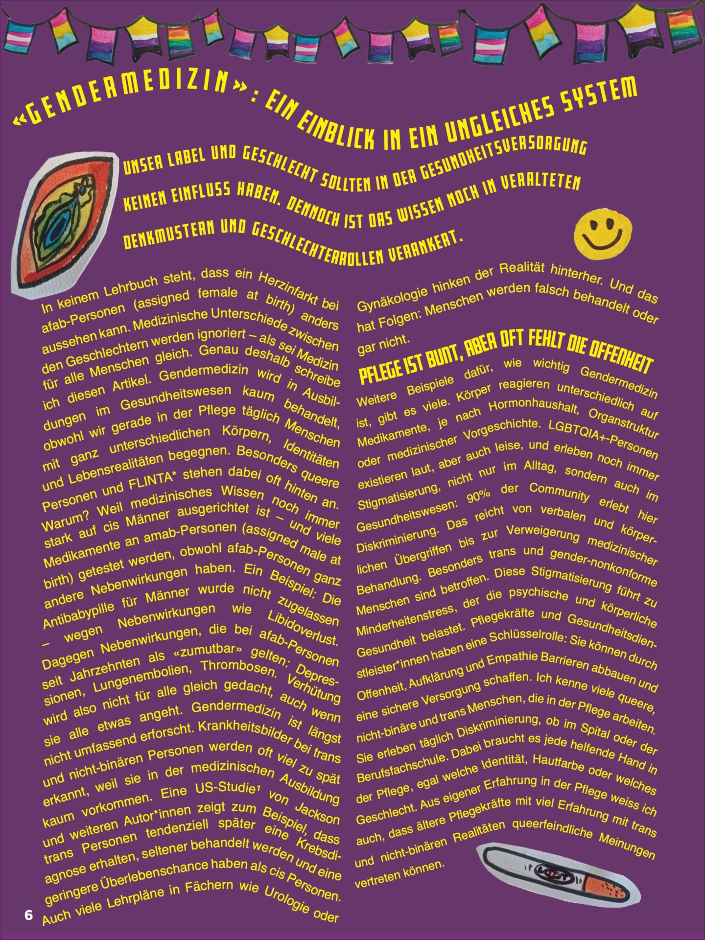 In keinem Lehrbuch steht, dass ein Herzinfarkt bei afab-Personen (assigned female at birth) anders aussehen kann. Medizinische Unterschiede zwischen den Geschlechtern werden ignoriert – als sei Medizin für alle Menschen gleich. Genau deshalb schreibe ich diesen Artikel. Gendermedizin wird in Ausbildungen im Gesundheitswesen kaum behandelt, obwohl wir gerade in der Pflege täglich Menschen mit ganz unterschiedlichen Körpern, Identitäten und Lebensrealitäten begegnen. Besonders queere Personen und FLINTA* stehen dabei oft hinten an. Warum? Weil medizinisches Wissen noch immer stark auf cis Männer ausgerichtet ist – und viele Medikamente an amab-Personen (assigned male at birth) getestet werden, obwohl afab-Personen ganz andere Nebenwirkungen haben. Ein Beispiel: Die Antibabypille für Männer wurde nicht zugelassen – wegen Nebenwirkungen wie Libidoverlust. Dagegen Nebenwirkungen, die bei afab-Personen seit Jahrzehnten als «zumutbar» gelten: Depressionen, Lungenembolien, Thrombosen. Verhütung wird also nicht für alle gleich gedacht, auch wenn sie alle etwas angeht. Gendermedizin ist längst nicht umfassend erforscht. Krankheitsbilder bei trans und nicht-binären Personen werden oft viel zu spät erkannt, weil sie in der medizinischen Ausbildung kaum vorkommen. Eine US-Studie¹ von Jackson und weiteren Autor*innen zeigt zum Beispiel, dass trans Personen tendenziell später eine Krebsdiagnose erhalten, seltener behandelt werden und eine geringere Überlebenschance haben als cis Personen. Auch viele Lehrpläne in Fächern wie Urologie oder Gynäkologie hinken der Realität hinterher. Und das hat Folgen: Menschen werden falsch behandelt oder gar nicht.