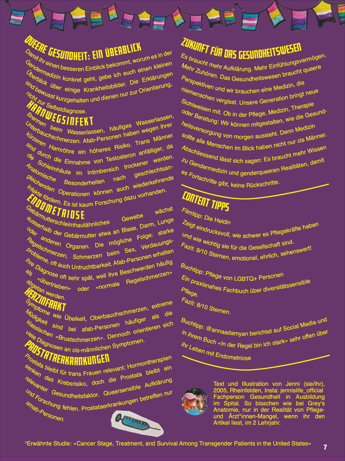 Weitere Beispiele dafür, wie wichtig Gendermedizin ist, gibt es viele. Körper reagieren unterschiedlich auf Medikamente, je nach Hormonhaushalt, Organstruktur oder medizinischer Vorgeschichte. LGBTQIA+-Personen existieren laut, aber auch leise, und erleben noch immer Stigmatisierung, nicht nur im Alltag, sondern auch im Gesundheitswesen: 90% der Community erlebt hier Diskriminierung. Das reicht von verbalen und körperlichen Übergriffen bis zur Verweigerung medizinischer Behandlung. Besonders trans und gender-nonkonforme Menschen sind betroffen. Diese Stigmatisierung führt zu Minderheitenstress, der die psychische und körperliche Gesundheit belastet. Pflegekräfte und Gesundheitsdienstleister*innen haben eine Schlüsselrolle: Sie können durch Offenheit, Aufklärung und Empathie Barrieren abbauen und eine sichere Versorgung schaffen. Ich kenne viele queere, nicht-binäre und trans Menschen, die in der Pflege arbeiten. Sie erleben täglich Diskriminierung, ob im Spital oder der Berufsfachschule. Dabei braucht es jede helfende Hand in der Pflege, egal welche Identität, Hautfarbe oder welches Geschlecht. Aus eigener Erfahrung in der Pflege weiss ich auch, dass ältere Pflegekräfte mit viel Erfahrung mit trans und nicht-binären Realitäten queerfeindliche Meinungen vertreten können.