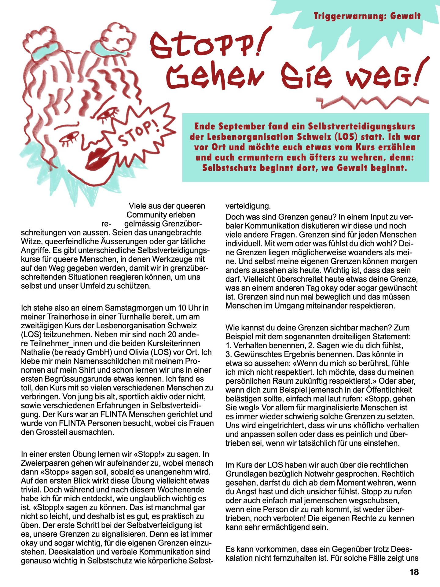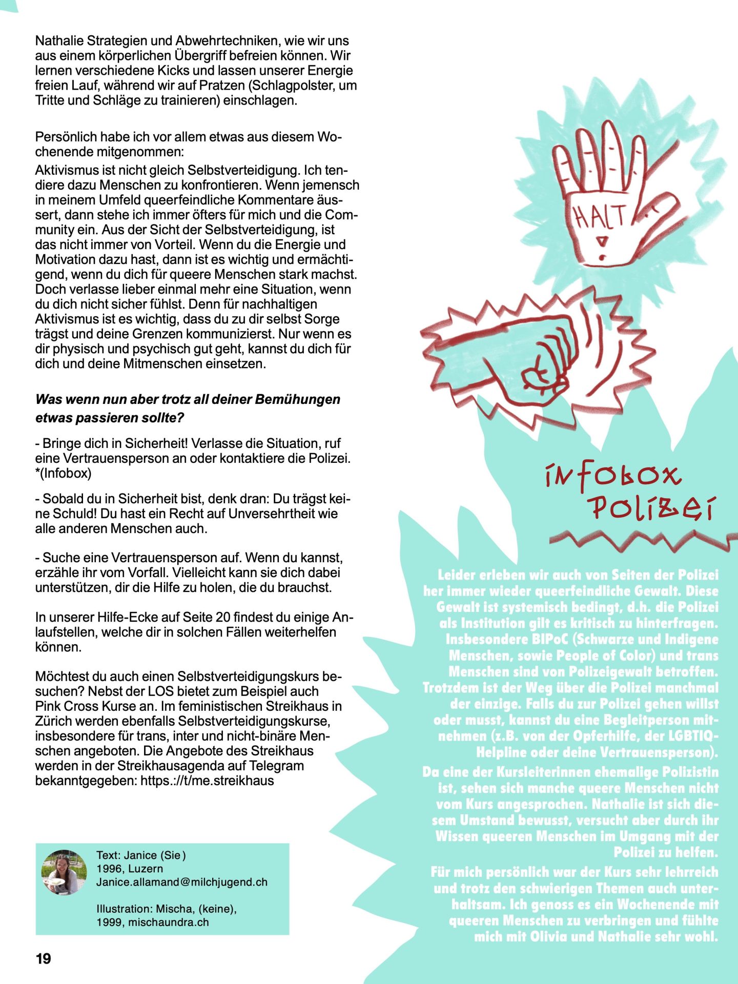 Möchtest du auch einen Selbstverteidigungskurs besuchen? Nebst der LOS bietet zum Beispiel auch Pink Cross Kurse an. Im feministischen Streikhaus in Zürich werden ebenfalls Selbstverteidigungskurse, insbesondere für trans, inter und nicht-binäre Menschen angeboten. Die Angebote des Streikhaus werden in der Streikhausagenda auf Telegram bekanntgegeben: https.://t/me.streikhaus