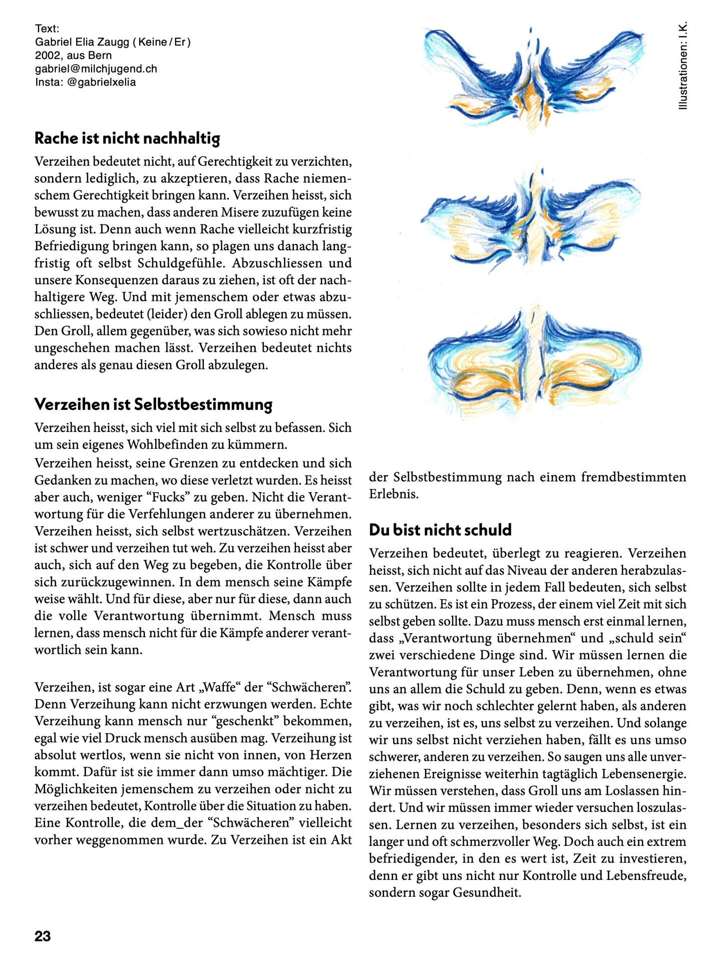 Verzeihen ist etwas, das mensch, wenn überhaupt, widerwillig tut. Und besonders wenn etwas passiert, was wir als „schlimm“ empfinden, lernen wir früh, möglichst lange wütend zu sein. Oft sehen wir, wie Personen, zu denen wir hochschauen, jahrelang Groll hegen, statt sich zu versöhnen. Gegen aussen müssen wir die „Beschuldigten“ dann hassen, während wir uns innerlich oft selbst hinterfragen. Wie konnte es so weit kommen? Wie konnte jemensch mir das antun? Habe ich etwas falsch gemacht? Für manche Dinge beginnen wir uns dann selbst die Schuld zu geben. Und so lässt uns die Gedankenspirale nicht mehr los.