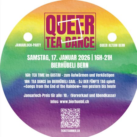Veranstaltungskategorie: Party Queer Tea Dance im Hübeli 17. Jan., 16:00 – 21:00 «Songs from the End of the Rinbow»: DJ DER FÜNFTE TAG ist ein Kind der 80er, als die Welt in Neonfarben getaucht und bunt war. Er spielt Songs von damals…