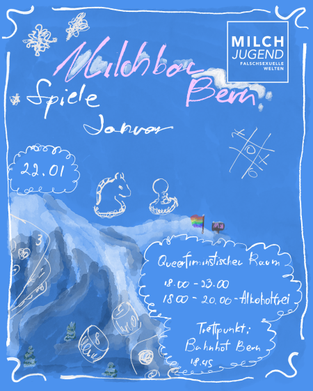 Veranstaltungskategorien: Bar · Jugendtreff Milchbar Bern: Spiele Januar 22. Jan., 18:00 – 23:00 „Spiele Januar“ in der Milchbar Bern! Wir starten ins neue Jahr mit chilligen Spielen und guter Stimmung. Willst du neue queere Freunde finden oder einfach nur an der Bar entspannen?…