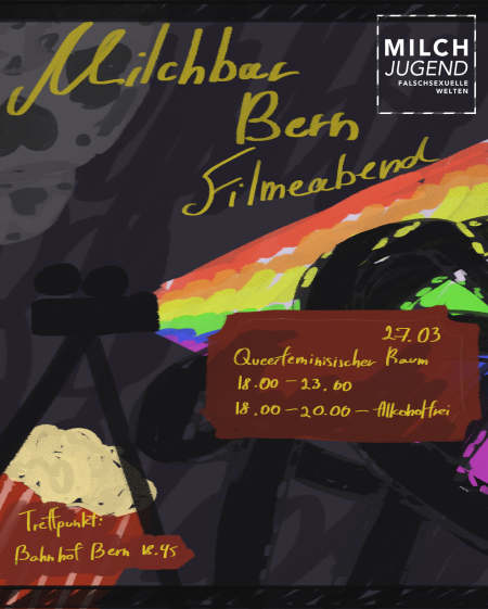 Veranstaltungskategorien: Bar · Film · Jugendtreff Milchbar Bern: Filmeabend 27. Mrz., 18:00 – 23:00 Die Milchbar Bern ist zurück! Diesen März laden wir dich zu unserem Filmabend ein! Wir haben einige queere Filme ausgesucht, die ihr in guter Atmosphäre schauen könnt. Milchbar Bern ist…