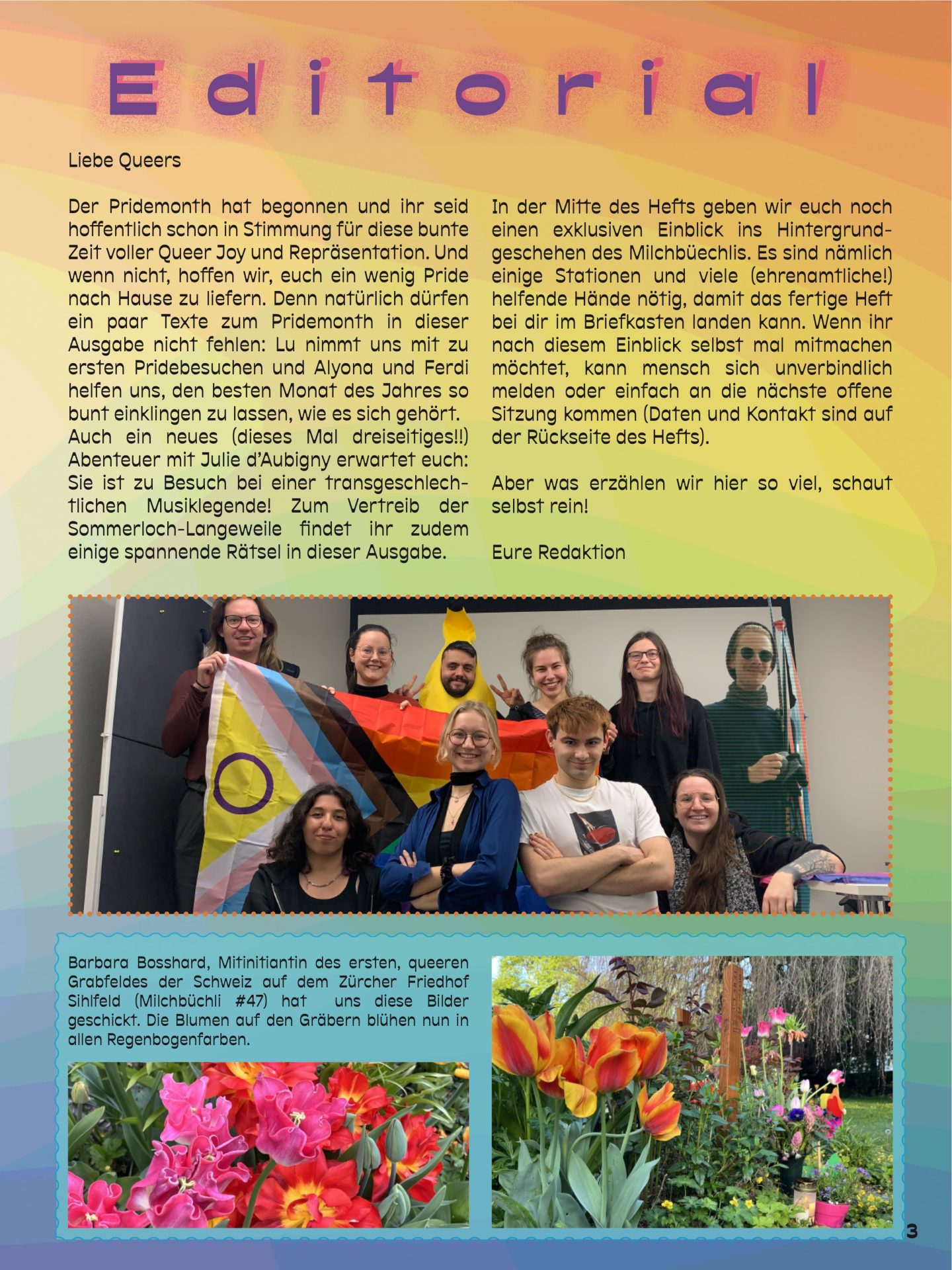 In der Mitte des Hefts geben wir euch noch einen exklusiven Einblick ins Hintergrundgeschehen des Milchbüechlis. Es sind nämlich einige Stationen und viele (ehrenamtliche!) helfende Hände nötig, damit das fertige Heft bei dir im Briefkasten landen kann. Wenn ihr nach diesem Einblick selbst mal mitmachen möchtet, kann mensch sich unverbindlich melden oder einfach an die nächste offene Sitzung kommen (Daten und Kontakt sind auf der Rückseite des Hefts).