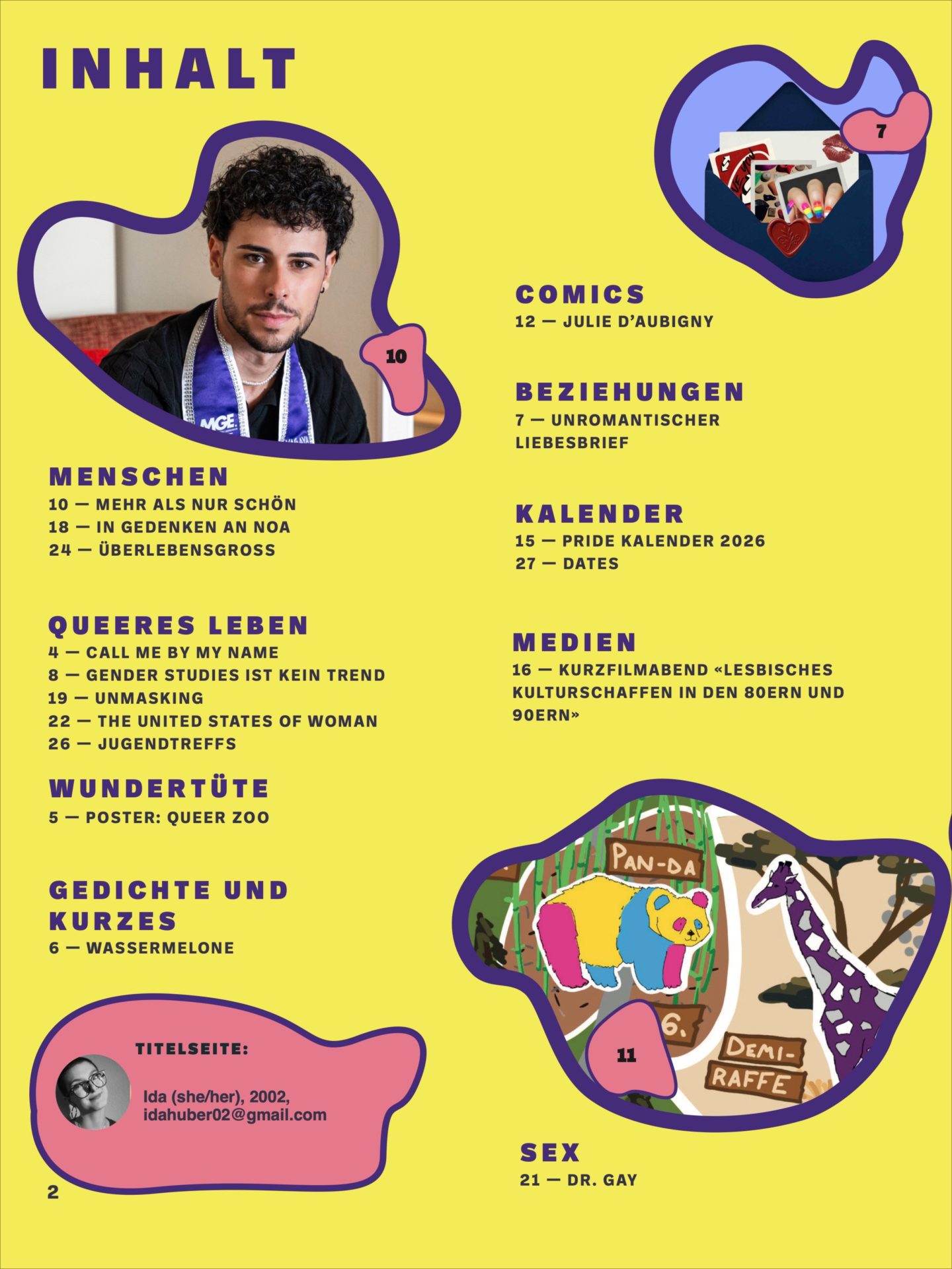 Diesmal haben wir wieder viele coole Texte für euch. Darunter sind gleich zwei exklusive Interviews: Hiba hat den ersten Mister Gay Europe aus der Schweiz getroffen und Jenni sprach mit Mona Gamie über ihre Laufbahn als Drag Queen. Kathrin und Lu sind beide zur Post gegangen: Kathrin mit einem unromantischen Liebesbrief und Lu macht so den ersten Schritt zur Namensänderung. Anna, Clara und Michelle berichten euch in ihren Texten über lesbisches Kulturschaffen und das Magnus Hirschfeld «Institut für Sexualwissenschaften». Und selbstverständlich darf auch ein weiterer Zeitreise-Comic von Ferdi nicht fehlen, denn die Reise geht schon bald ihrem Ende zu. Seid gespannt auf das baldige Finale der langjährigen Comic-Reihe!